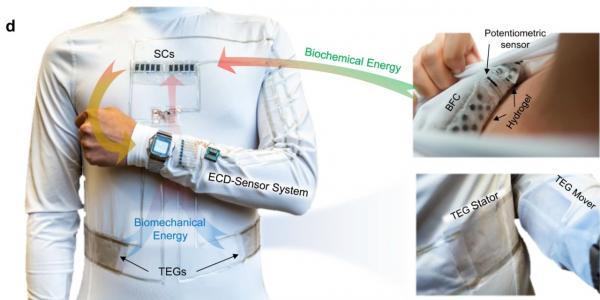 Las microrredes en la camiseta desarrollada funcionan a partir de tres ejes: biocombustible impulsado por el sudor, generadores triboeléctricos que funcionan con el movimiento, y los supercondensadores que almacenan la energía.