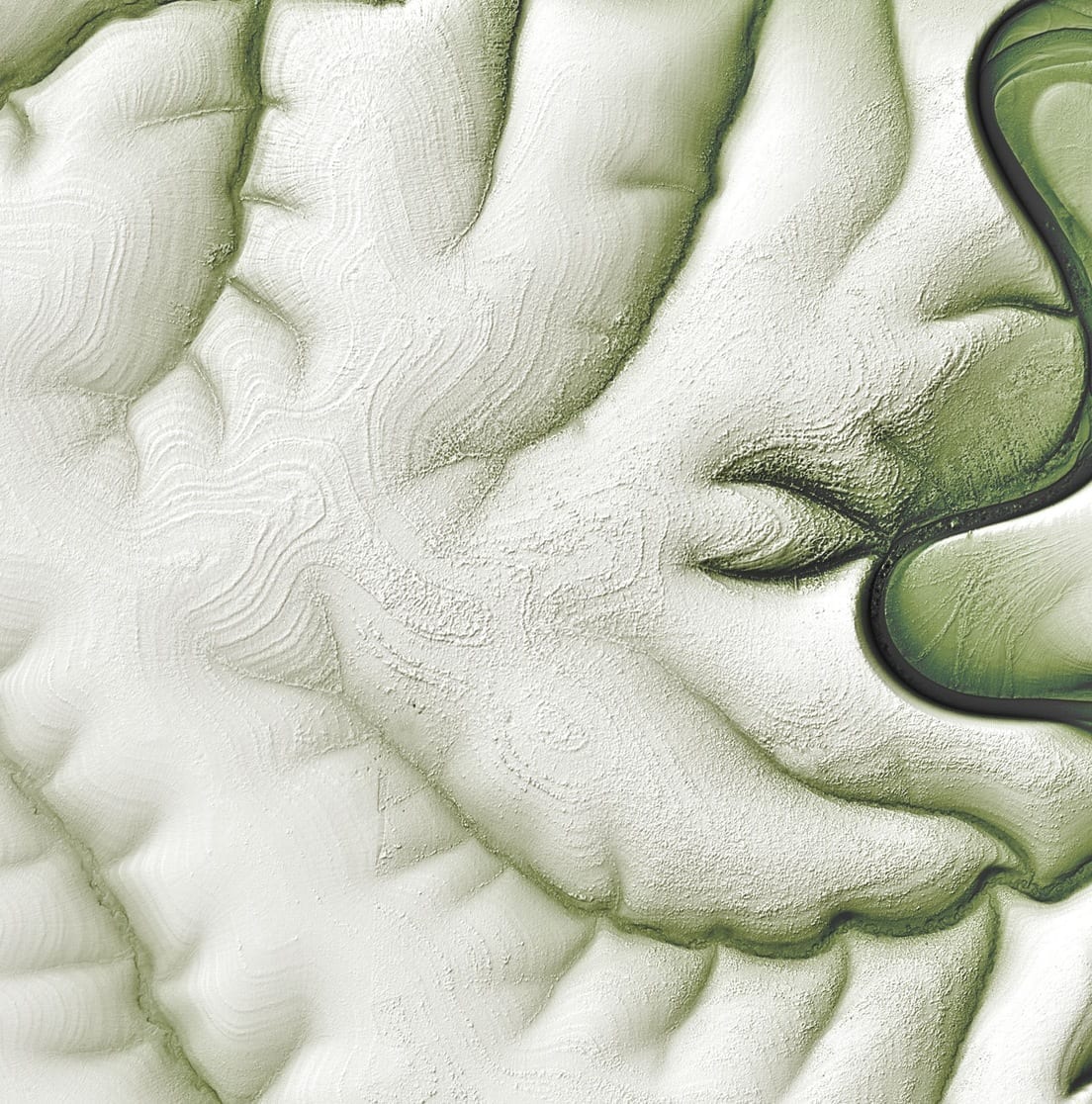 En invierno, las partes planas se cubren de nieve, haciéndose más claras, mientras que las zonas oscuras corresponden a declives. El desvanecimiento del patrón rayado en los bordes se debería al amontonamiento sedimentario ocasionado por una erosión que se ha prolongado por millones de años.