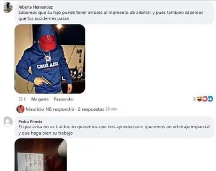 Una de las publicaciones más alarmantes muestra a un individuo enmascarado, portando indumentaria del equipo Cruz Azul y sosteniendo un arma de fuego, mientras advierte sobre posibles “accidentes” en caso de errores arbitrales.