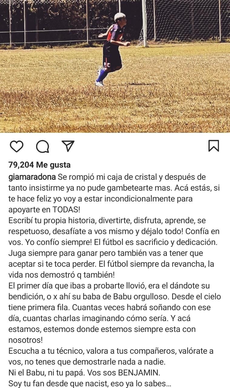 Gianinna Maradona, la hija de Diego y Claudia Villafañe solo había compartido un posteo abrazando a su hijo durante uno de los entrenamientos con el emoji de un corazón, pero luego contó todo. Dijo que sabía que esto era inetivable y solo le pedía a su hijo disfrutar, ser feliz, divertirse, aprender y escuchar a sus compañeros ya sus entrenadores. Y le dijo que no tenía nada que demotrarle a nadie, que no sintiera presión por ser un Agüero Maradona, que solo era Benjamín.