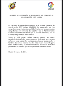 La Real Federación Española de Futbol (RFEF) y la LaLiga han mandando un comunicado en donde señalan que las competencias de futbol en España se suspenden hasta que el Gobierno considere que no hay riesgo para la salud, debido al Estado de Alarma en aquel país por el covid-19.