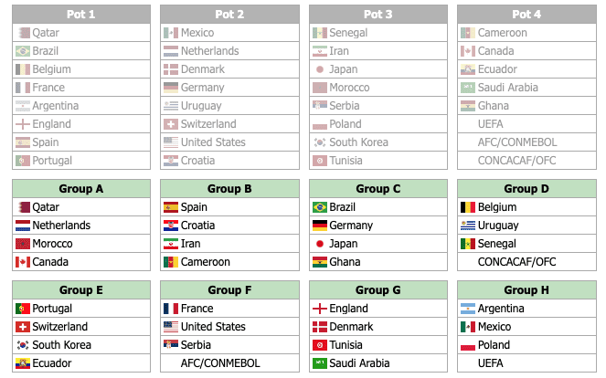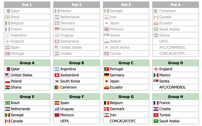 Aquí te dejamos una de las tantas combinaciones que nos dio este simulador del sorteo del Mundial Qatar 2022. Como podemos ver Qatar recibe en su grupo a Estados Unidos. Argentina se queda con Suiza y Camerún. Portugal y Alemania quedan con Ecuador y Japón; mientras que México queda junto a Inglaterra y Serbia. Brasil, Holanda y Senegal quedan juntos, lo mismo que España y Uruguay, dos campeones del mundo. Bélgica y Dinamarca van al G y en el H quedarían los dos quipos que llegaron a la final del Rusia 2018, el campeón y el subcampeón del mundo: Francia y Croacia.