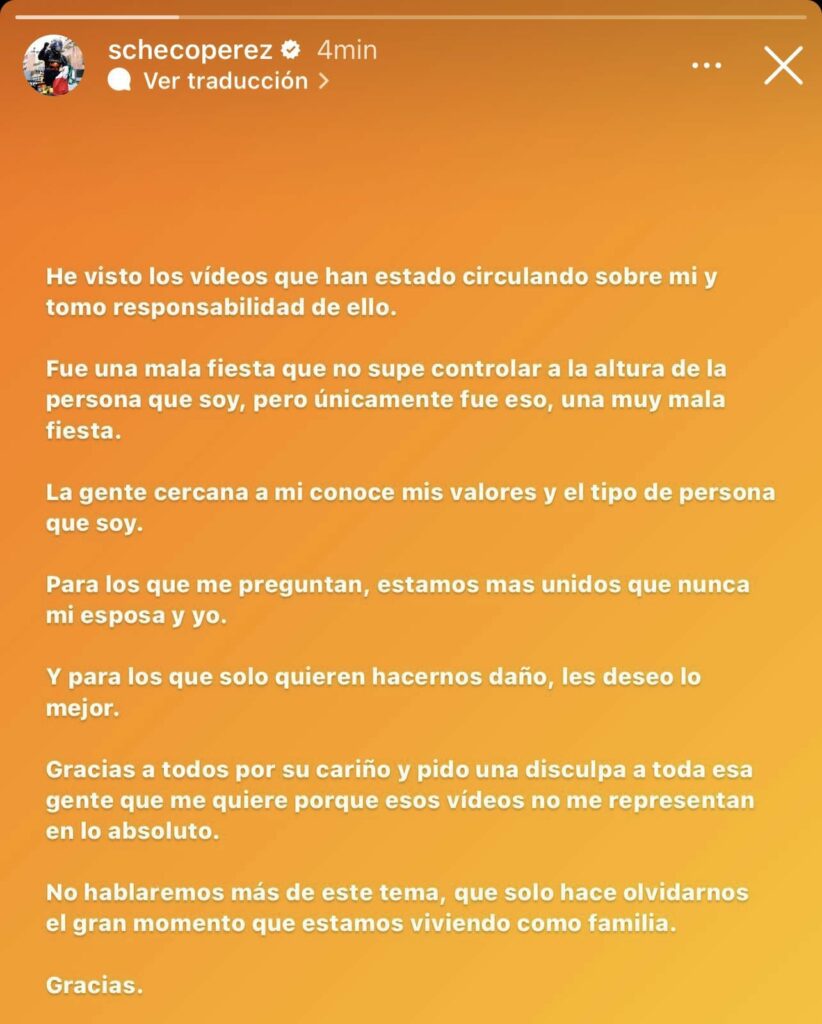 Tras el revuelo causado por estas imágenes, Sergio “Checo” Pérez se disculpó por medio de sus redes sociales. Dijo que su comportamiento en esta mala fiesta no lo representa. Y aunque no reconoció si había sido infiel o no, dijo que él y su esposa estaban más unidos que nunca y que le deseaba lo mejor a quienes solo quieren hacerle daño.