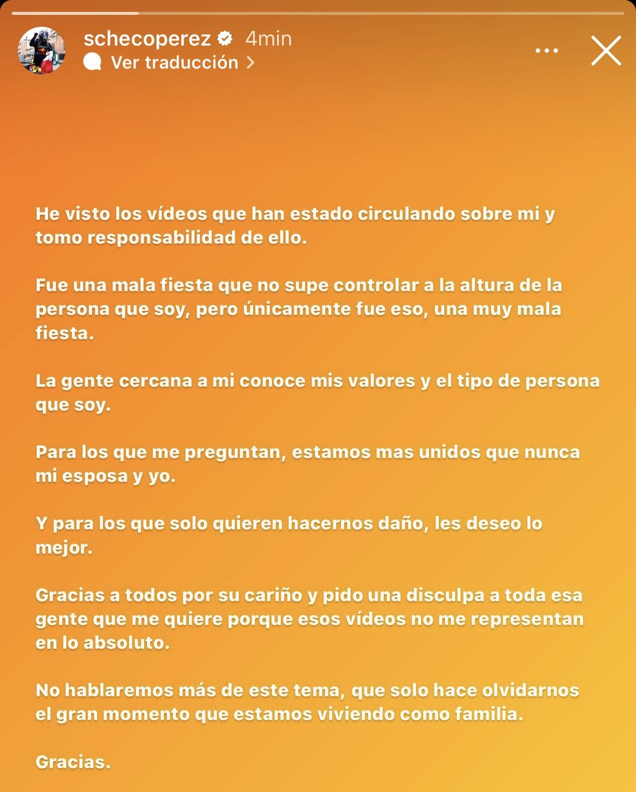 “La gente cercana a mí conoce mis valores y el tipo de persona que soy. Para los que me preguntan, estamos más unidos que nunca mi esposa y yo. Y para los que solo quieren hacernos daño, les deseo lo mejor”, agregó.