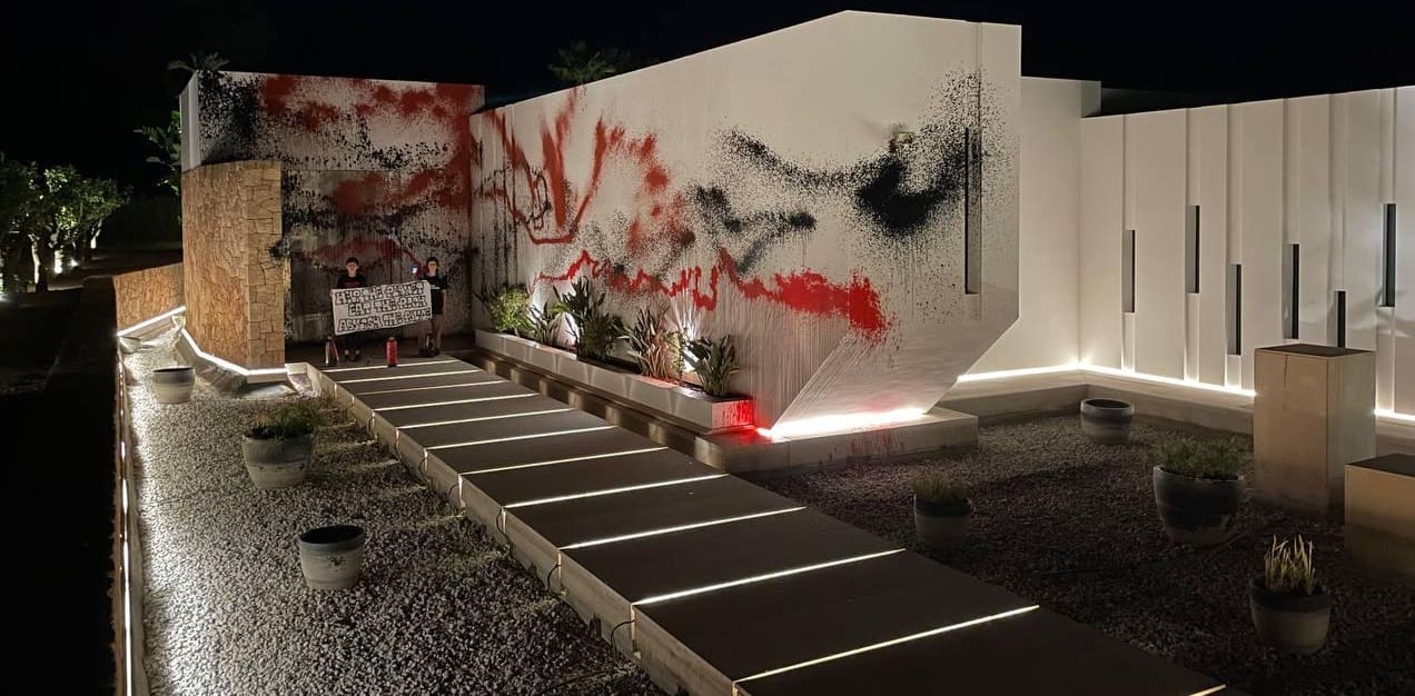El video capturado por activistas ambientales muestra cómo pintaron las paredes de la fachada blanca de la casa con mensajes impactantes: “Ayudar al planeta y comerse a los ricos”. Además, una pancarta con la leyenda “Abolir la policía” fue desplegada frente al inmueble.
