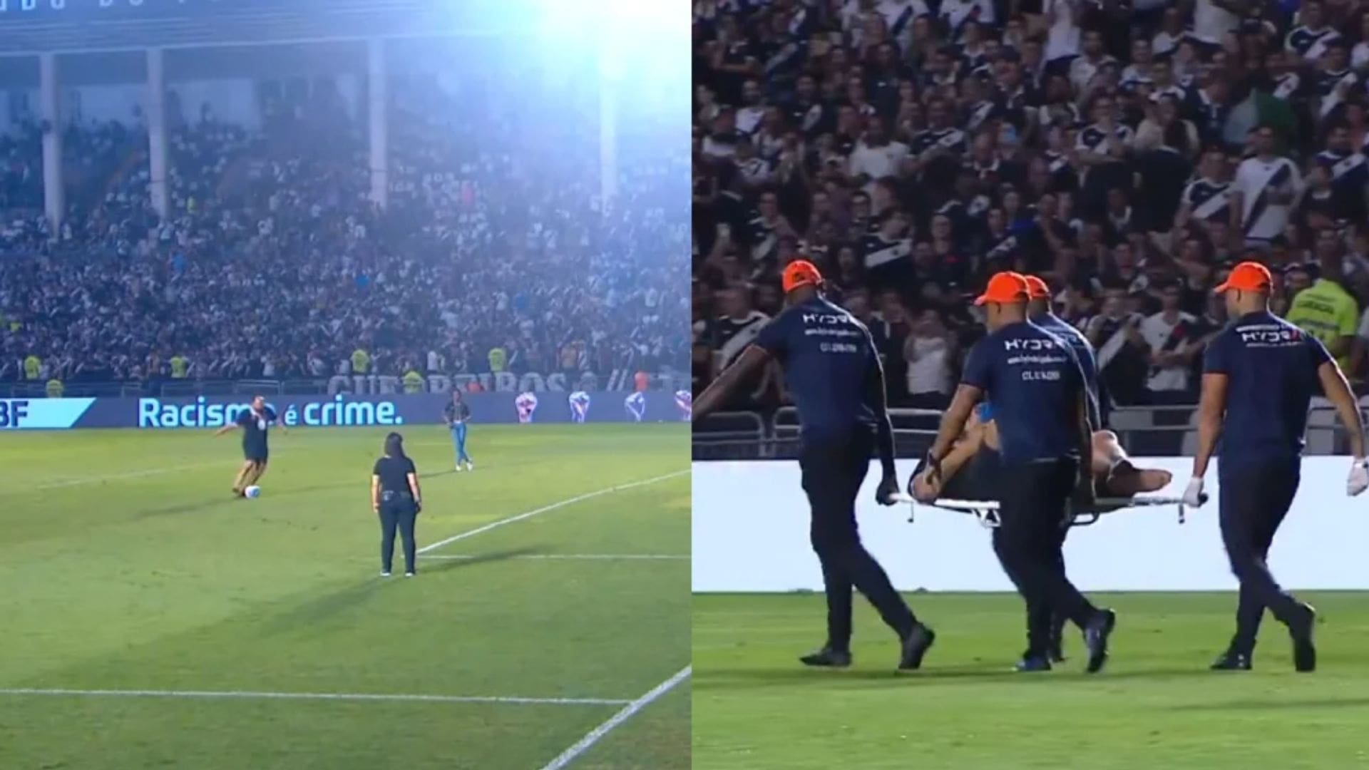 Los gritos de dolor del aficionado del Vasco da Gama por fracturarse el tobillo hicieron que enseguida entraran los paramédicos y lo sacaran en camilla, para después llevarlo al hospital.