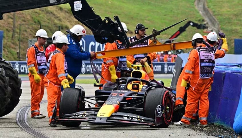 Checo Pérez golpeó el muro de contención de lado, siendo la parte izquierda de su bólido la más afectada, por lo que la integridad de varias piezas importantes quedaron comprometidas para la carrera del domingo.