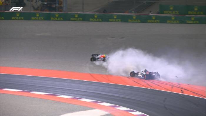 El piloto mexicano de Red Bull se vio involucrado en un triple choque durante la vuelta 11 de la competencia junto a Esteban Ocon y Nico Hulkenberg, y terminó atorado en la arena del circuito internacional de Lusail.