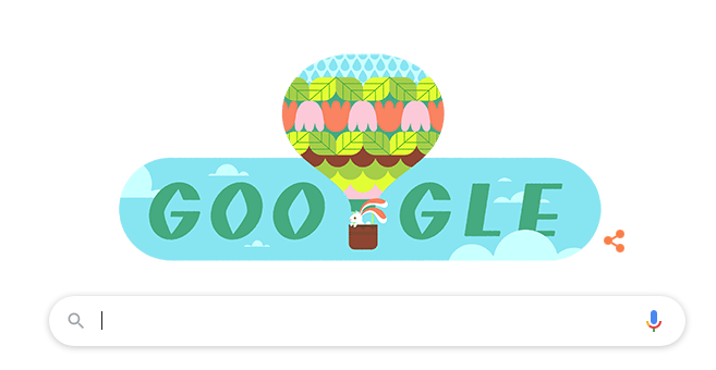 El doodle muestra el dibujo de un globo aerostático en el que viaja un conejo. Al fondo se aprecia el cielo sobre el que se lee la palabra Google.
