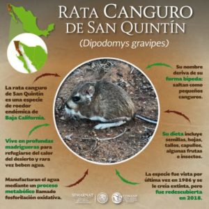 Se trata de la especie Dipodomys conocida como rata canguro de San Quintín, la cual se había declarado como extinta ya que la última vez que se le vio fue en 1986, su desaparición fue atribuida al incremento agrícola y la deforestación de la zona, dos factores que acabaron con su hábitat.