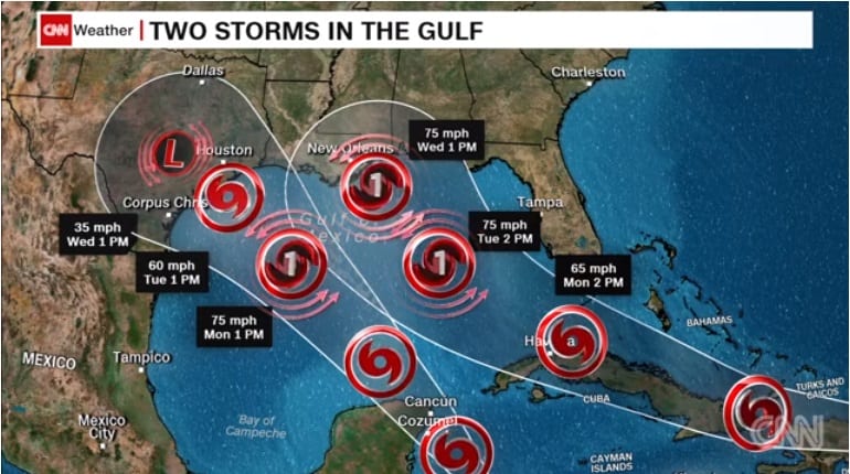 “Podríamos estar viendo dos recaladas en una cuestión de solo uno o dos días entre el principio y la mitad de la próxima semana, lo cual es un hecho sin precedentes cuando hablamos de dos potenciales huracanes en el Golfo de México”, inidcó Jennifer Gray a CNN.