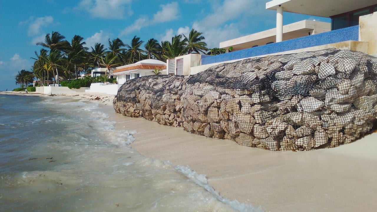 Residentes del exclusivo fraccionamiento de Playacar colocaron una escollera afuera de un domicilio para evitar la erosión y afectaciones a la estructura habitacional.