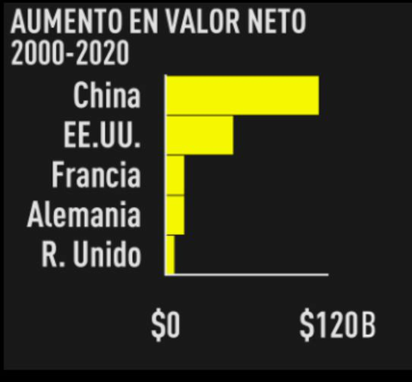 Entre los diez países, China representó el 50% del crecimiento del patrimonio neto, o riqueza, entre 2000 y 2020, seguida de Estados Unidos, con el 22%.