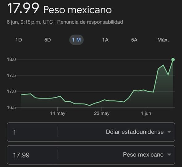 En la jornada de hoy el dólar estadounidense se negocia al cierre de sesión a 17.99 pesos mexicanos en promedio, lo cual implicó un cambio comparado con la cotización de la jornada previa de 17.53 pesos.