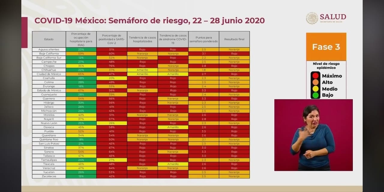 El Dr. Ricardo Cortés, titular de Promoción de la Salud, mostró la actualización del semáforo de salud Federal. “En el semáforo tenemos 15 estados de la República en máximo nivel de riesgo epidémico para Covid-19 y 17 en nivel alto, en naranja”, entre ellos Quintana Roo.