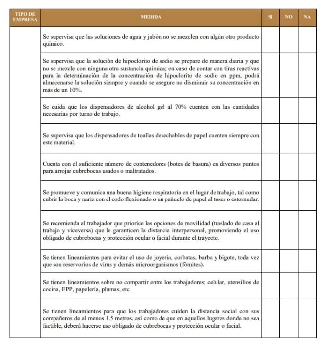 El anexo del documento con los “Lineamientos Técnicos de Seguridad Sanitaria en el Entorno Laboral”, estableció las estrategias que la Secretaría del Trabajo recomendó a las empresas y empleados, en la que a través de una serie de tablas de autoevaluación, los centros de trabajo pueden ver que elementos les falta por cumplir.