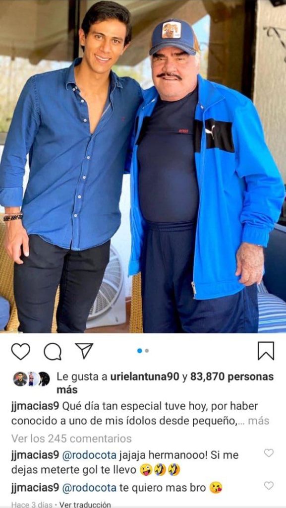Y es que alguien descubrió una publicación en Instagram del delantero de Chivas y ex de León, José Juan Macías, donde sube una foto con Vicente Fernández.