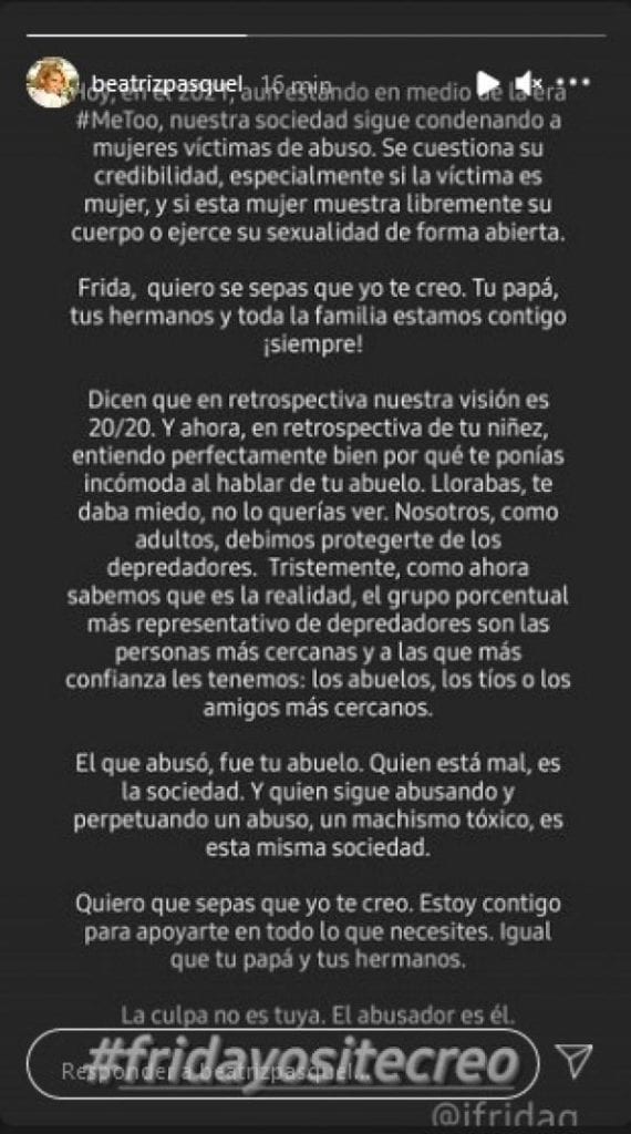 En una historia de Instagram, Beatriz utilizó el hashtag #fridayositecreo y expresó que ella apoya a Frida Sofia y reclama que, en la actualidad, todavía se cuestiona la credibilidad de las mujeres que han sufrido acoso sexual.