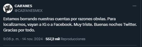 Cabe recordar que, a pesar de que la cuenta de Caifanes no estaba verificada oficialmente, mucha gente los seguía porque solían compartir información útil sobre sus giras de trabajo y nuevos lanzamientos, incluso llegaron tener interacción directa con los fans. Ahora toda su comunicación fue migrada a las redes propiedad de Mark Zuckerberg.
