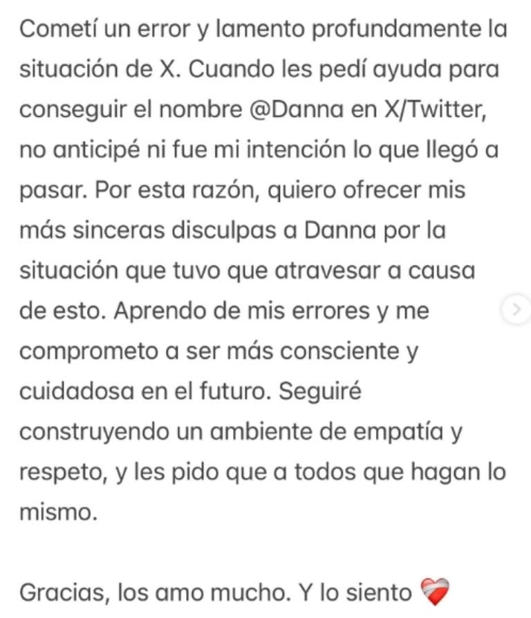 Después de que la situación se saliera de control, Danna regresó a las redes sociales para subir un escrito en el que se disculpó por todos los ataques que recibió la usuaria en X, antes Twitter, “Danna”. La cantante y actriz confesó que cometió un error que lamenta profundamente.