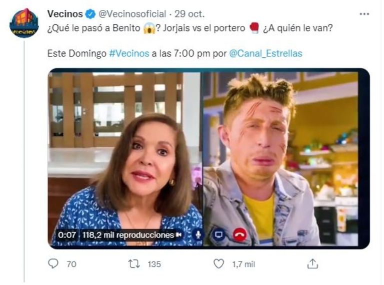 En la descripción de la publicación de redes sociales se puede leer: “¿Qué le pasó a Benito? Jorjais vs el portero ¿A quién le van? Este Domingo #Vecinos a las 7:00 pm por @Canal_Estrellas”.