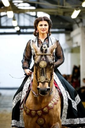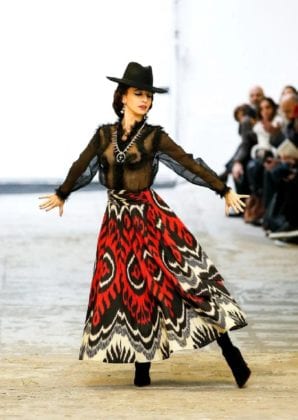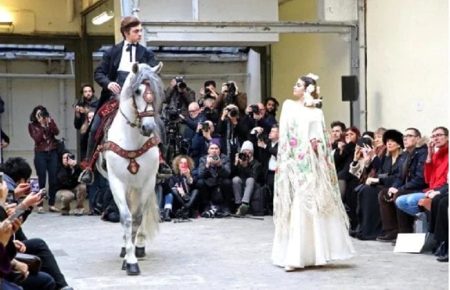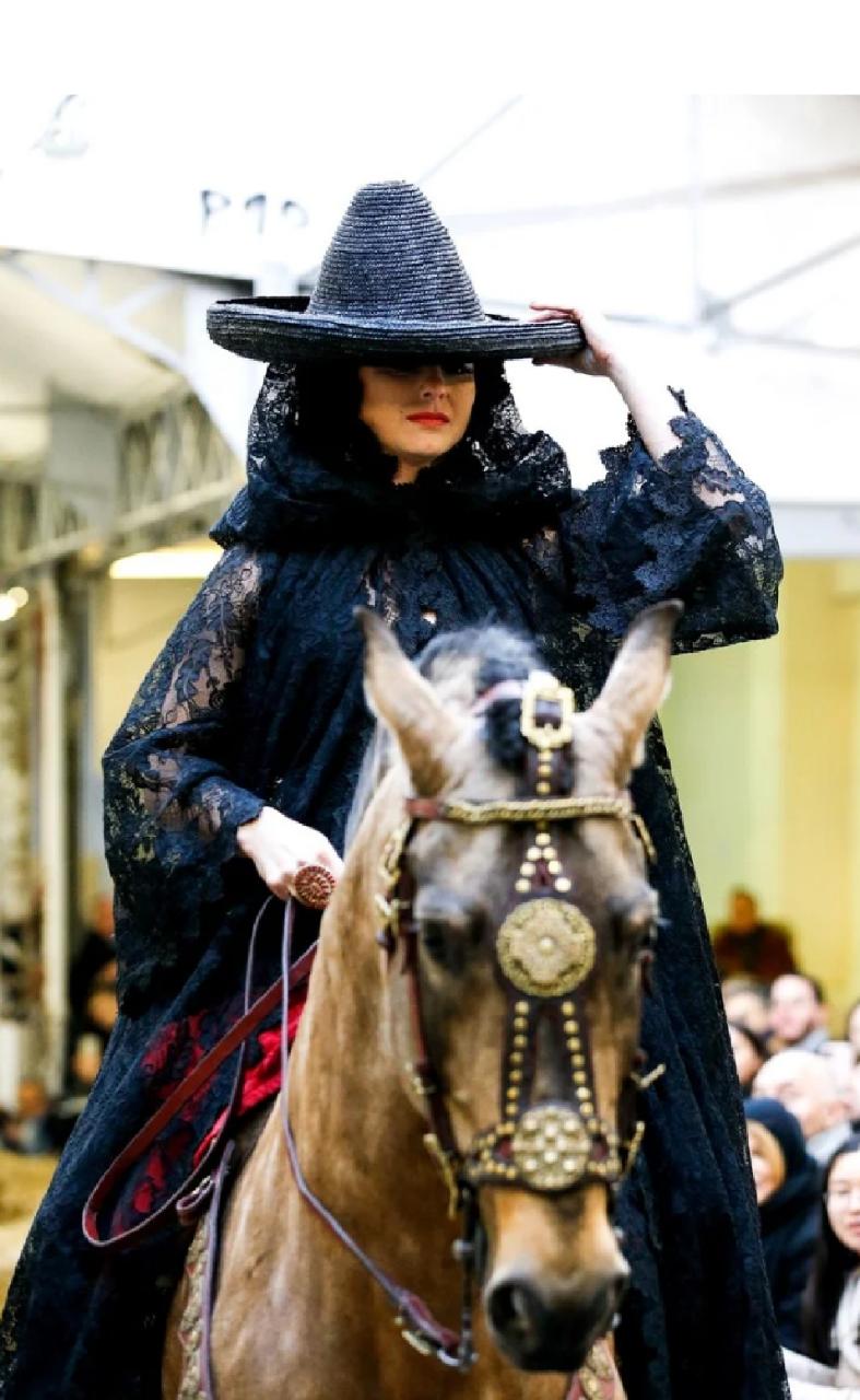 El diseñador en cuestión es el francés Franck Sorbier, quien presentó a sus modelos con vestimentas que recordaban al look de María Félix en películas como “Doñas Bárbara”, pues las modelos hicieron su entrada triunfal ¡a caballo!