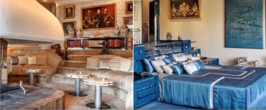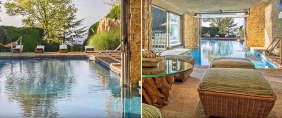 De acuerdo con las imágenes, la casa cuenta con una alberca que esta rodeada de árboles, un mini spa, una sala con chimenea y nueve habitaciones.
