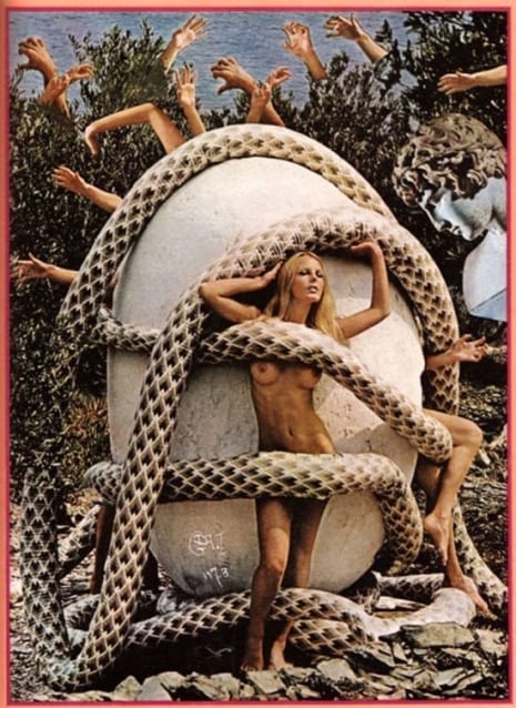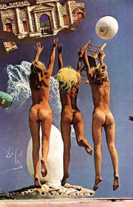 Dalí trabajó con el famoso fotógrafo de Playboy Pompeo Posar, y juntos retrataron un huevo gigante, una serpiente gigante, algunos collages que mezclaban una botella de Coca-Cola con arquitectura renacentista y, por supuesto, las conejitas desnudas o semidesnudas jugando en el Sol.