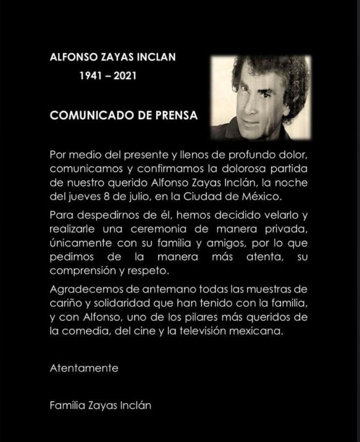 En dicho texto, familiares y amigos pidieron respeto a la decisión de llevar a cabo una ceremonia privada para despedirse de Alfonso Zayas.
