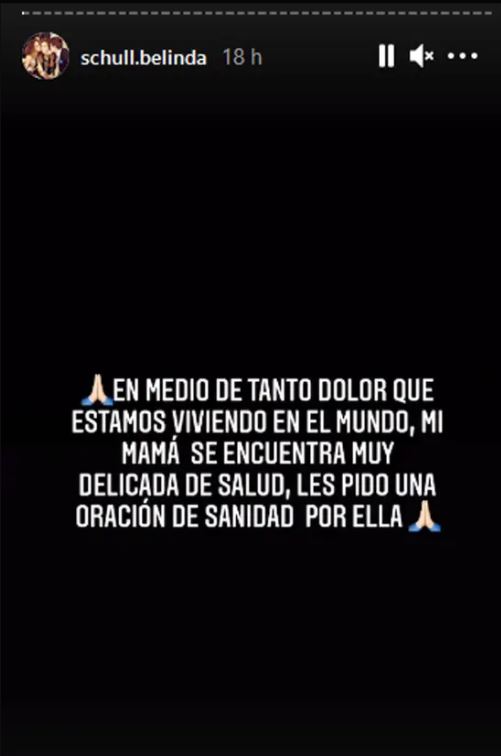 “En medio de tanto dolor que estamos viviendo en el mundo, mi mamá se encuentra muy delicada de salud. Les pido una oración de sanidad por ella”, escribió Schüll.