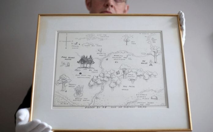 Dicho dibujo contiene el mapa del Bosque de los Cien Acres de Winnie Pooh y fue realizado por el ilustrador, E.H. Shepard, el mapa fue adquirido por la casa de subastas Sotheyby´s en Londres por casi tres veces su valor estimado.