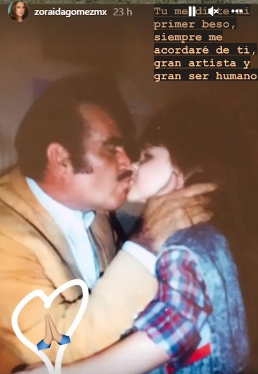 Zoraida Gómez aprovechó para despedirse de Vicente Fernández, tal como lo han hecho muchos otros famosos. Sin embargo la manera en la que ella lo hizo ha causado mucha polémica. Y es que la actriz compartió una foto con un mensaje que dice “Tú me diste mi primer beso”.