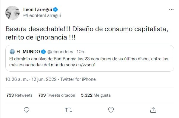 León Larregui publicó que Bad Bunny era basura desechable y generó una división de opiniones, debido a que algunos internautas apoyaron la postura y otros defendieron al puertorriqueño.