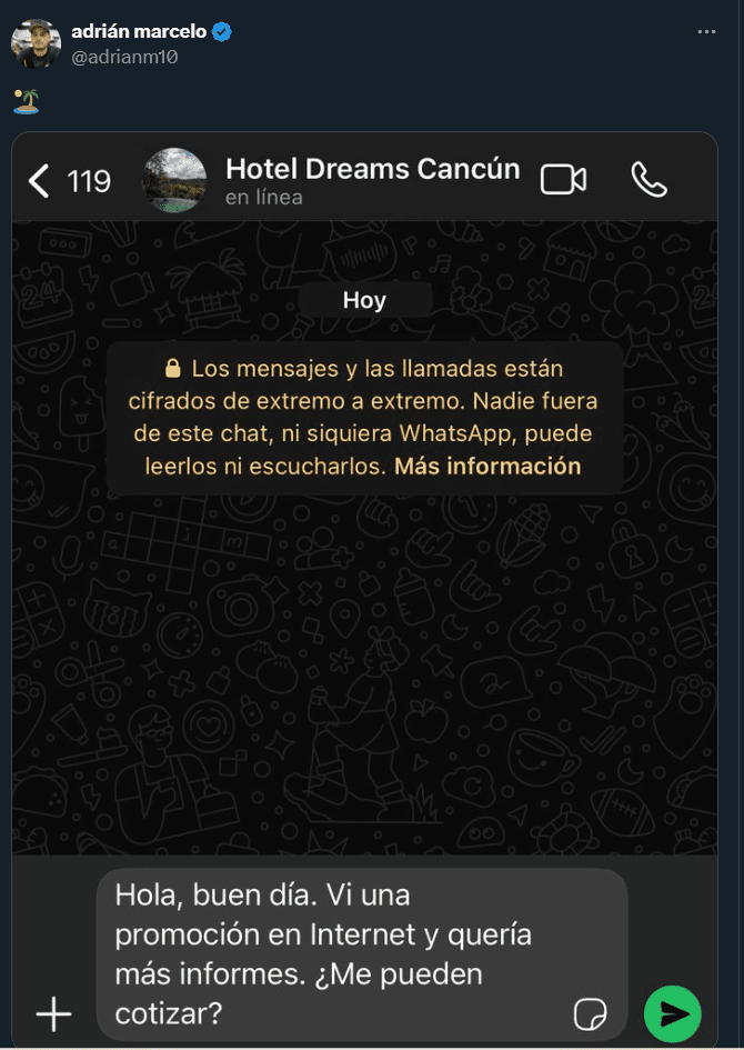 “Estoy muy triste y sacado de onda porque quiero advertir a la gente que tengan mucho cuidado cuando se metan a hacer reservaciones”, señaló Arath, quien había acordado los términos del hospedaje con el contacto en WhatsApp. Según el actor, la conversación parecía legítima, lo que lo llevó a confiar en la negociación.