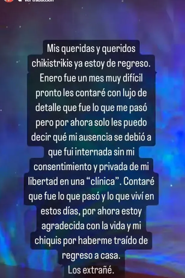 “Mis queridos chikistrikis, ya estoy de regreso. Enero fue un mes muy difícil, pronto les contaré con lujo de detalle que fue lo que me pasó, pero por ahora solo les puedo decir que mi ausencia se debió a que fui internada sin mi consentimiento y privada de mi libertad en una clínica”, comunicó la famosa.