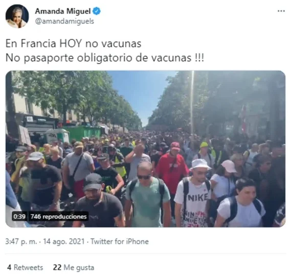 En julio de 2021 compartía las protestas sobre “la falsa pandemia”, que se hacían en Italia, las cuales incluían un hashtag que decía “dictadura sanitaria”, debido que se pedía libertad de decisión para inocularse.