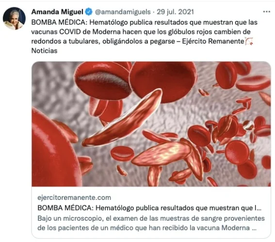 “BOMBA MÉDICA: Hematólogo publica resultados que muestran que las vacunas COVID de Moderna hacen que los glóbulos rojos cambien de redondos a tubulares, obligándolos a pegarse”, escribió en otra publicación.