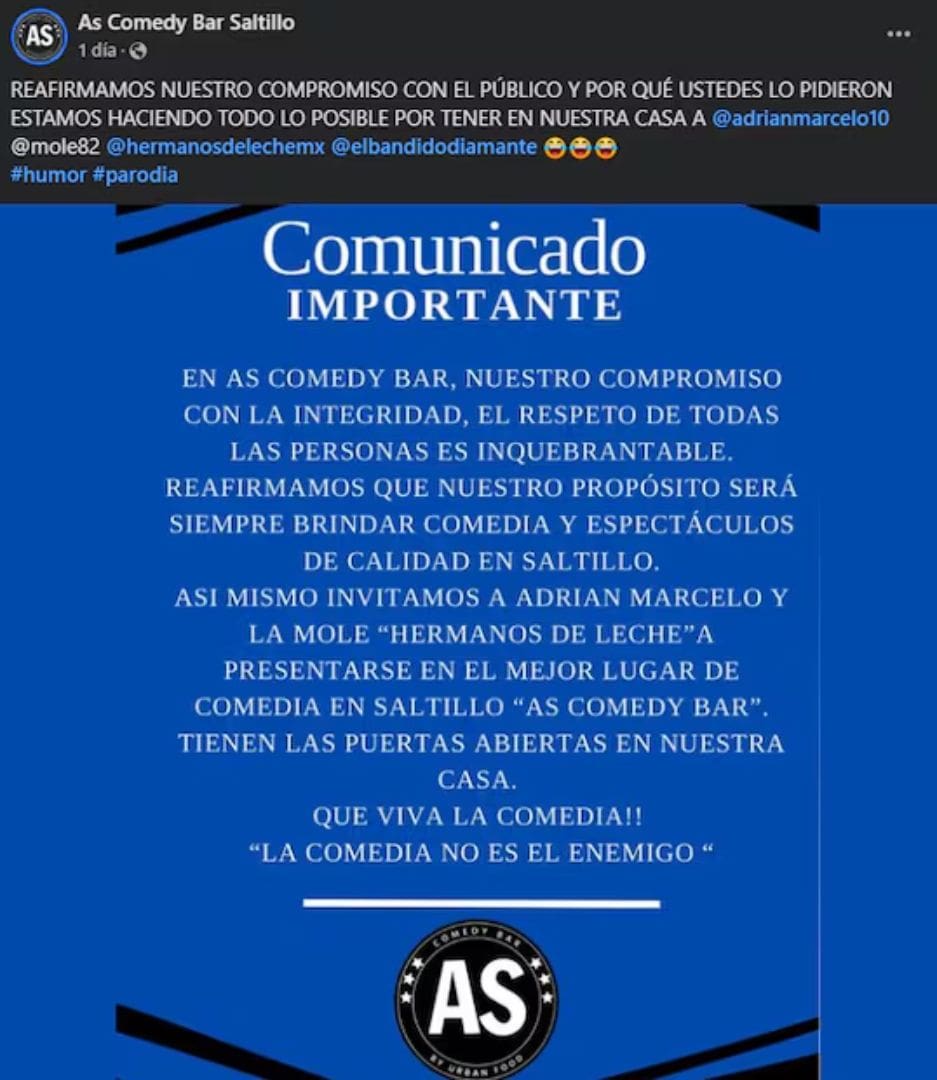 “El respeto de todas las personas es inquebrantable. Invitamos a Adrián Marcelo y La Mole ‘Hermanos de Leche’ a presentarse en el mejor lugar de comedia de Saltillo, As Comedy Bar. Tenemos las puertas abiertas de nuestra casa”, se lee en su comunicado, asegurando que “la comedia no es el enemigo”.