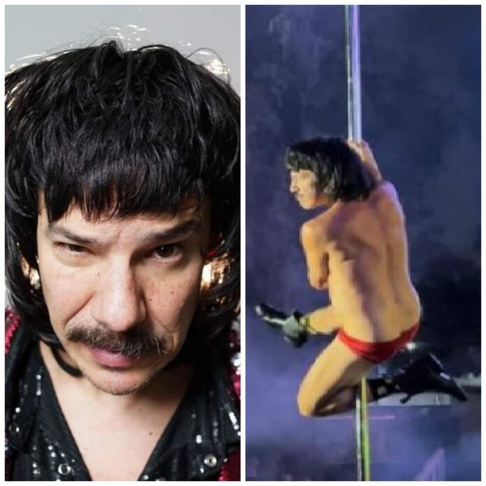 Esto, luego de que se desnudara al final de su presentación, portando únicamente un pequeño calzoncillo rojo, el cual se quitó después y posó sin ninguna prenda frente a los asistentes.
