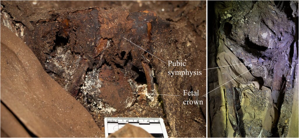 De acuerdo a las muestras que recopilaron los arqueólogos, concluyeron que la mujer murió entre los primeros tres meses del embarazo, por lo que el “parto” fue determinado como una “extrusión fetal parcial post mortem”.