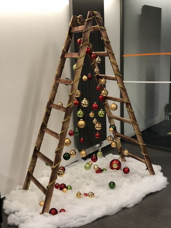 Si tienes una escalera de peldaños que no usas, la puedes agregar a tu decoración con pequeños detalles de plantas o flores naturales, esferas, luces y listo. Lo mismo puede aplicar en repisas verticales o incluso, libreros.