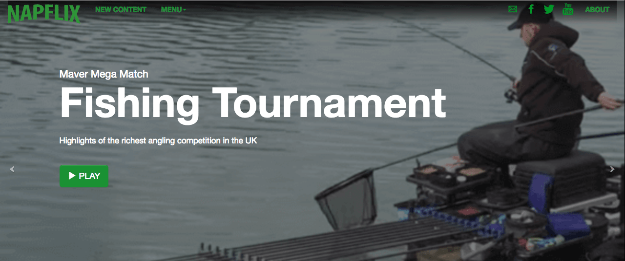 Las categorías de Napflix son: deportes, documental, música, educación, videojuegos, novedades, relajamiento, religión, publicidad y reacciones científicas.