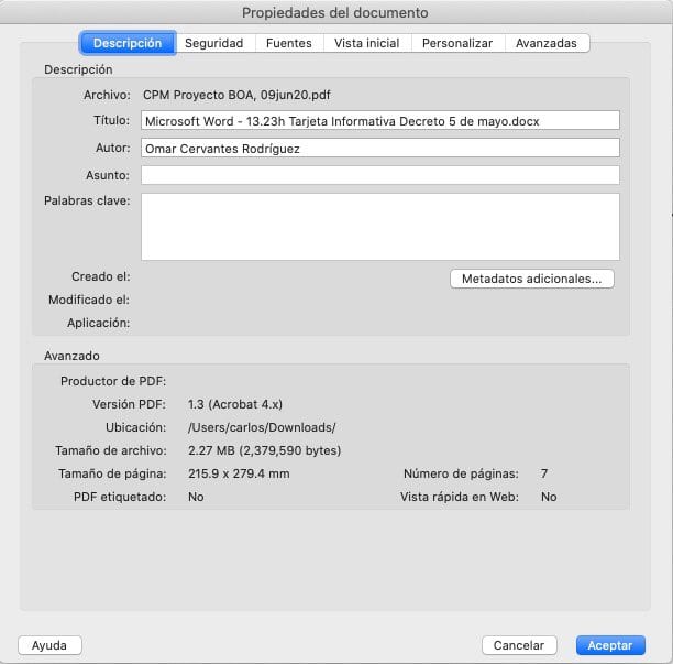 Además afirmó: “subi el archivo a un visualizador en linea de metadatos e instale un paquete de NPM para editar/visualizar metadatos y el archivo NO TIENE METADATOS DE AUTOR NI TITULO”.