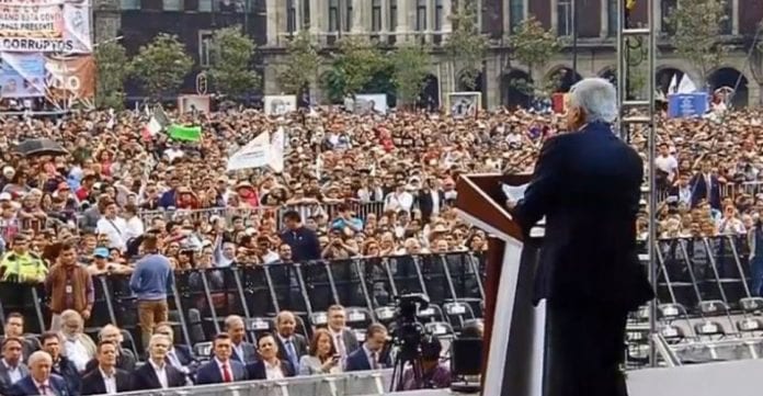 Acompañado de una lluvia moderada y cientos de ciudadanos, AMLO habló sobre su victoria electoral, la economía, la Guardia Nacional el huachicoleo, la reforma educativa y otros temas más.