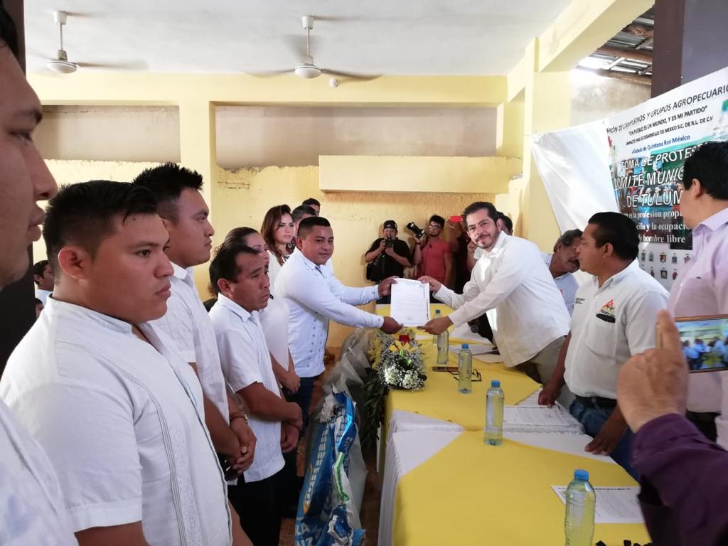 Virgilio Gómez Morales tomó protesta de Adolfo Hau como presidente de la organización Unión de Campesinos y Grupos Agropecuarios de Tulum, reconociendo el esfuerzo que realiza su dirigente estatal Francisco Uc, para orientar los esfuerzos de campesinos y comunidades indígenas en Quintana Roo, reconoció qué hay mucho por hacer para fortalecer e integrar al campo en el estado y ofreció el apoyo del gobierno para abrir el mercado que representa la Riviera Maya.