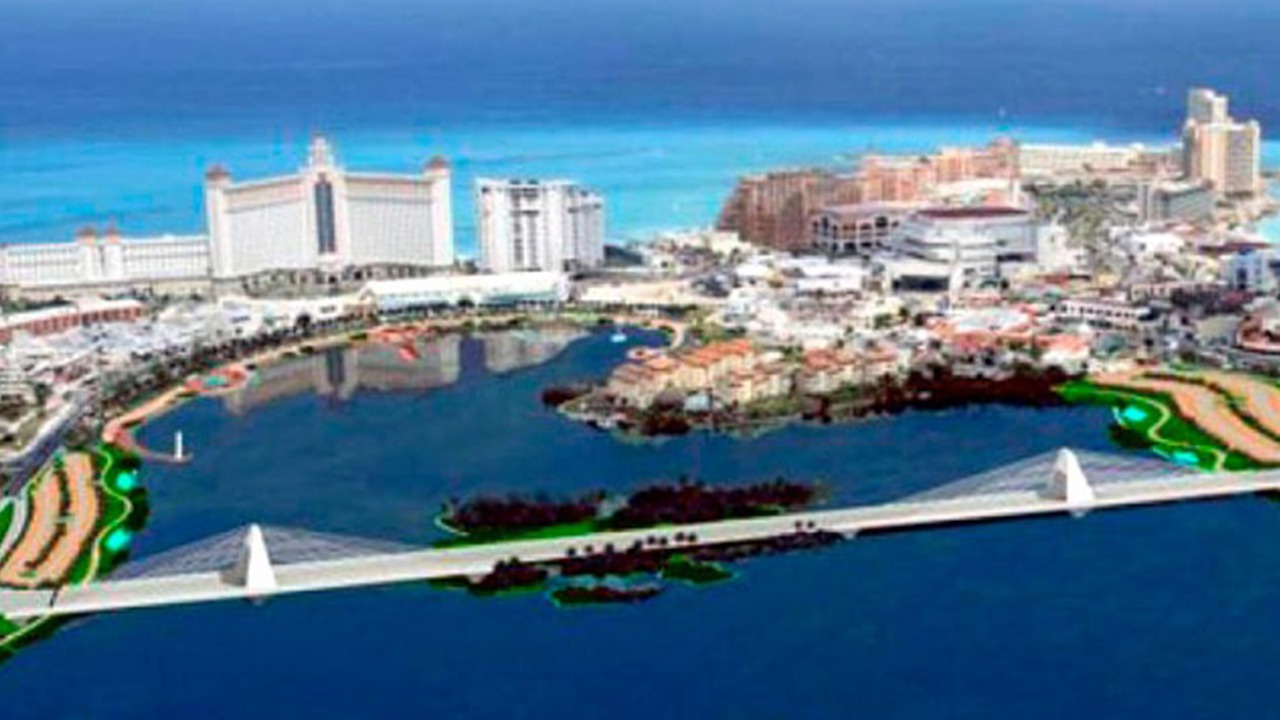 El puente sobre la laguna Nichupté, de 8.7 kilómetros de largo , será de cuota y unirá al bulevar Colosio (desde el distribuidor vial) con la avenida Kukulcán, en plena zona hotelera. Inicialmente se había previsto para 2021.