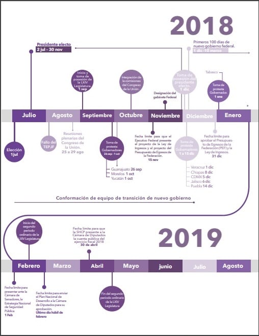 A principios de agosto se dará el fallo del Tribulal Electoral del Poder Judicial de la Federación (TEPJF) en cuanto a la validez de la elección. Del 25 al 29 de agosto se darán reuniones plenarias del Congreso de la Unión. A inicios de septiembre, arrancan los trabajos de la LXIV Legislatura.