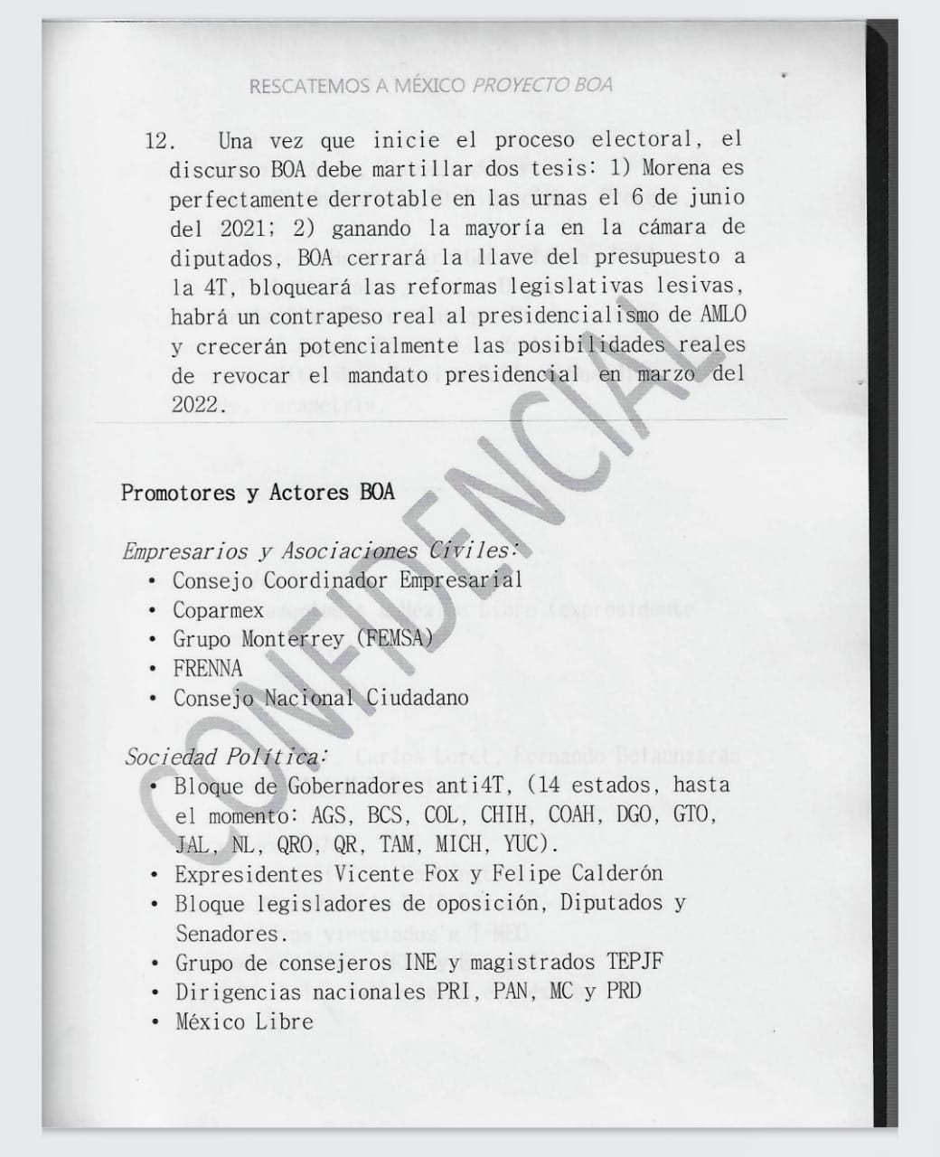 Entre los puntos expuestos de este “plan” se señala que habría la contratación de ‘influencers’ de redes sociales, la participación de periodistas críticos, gobernadores que se oponen a la 4T y expresidentes como Felipe Calderón y Vicente Fox, con el fin de generar un cambio en los comicios de 2021.