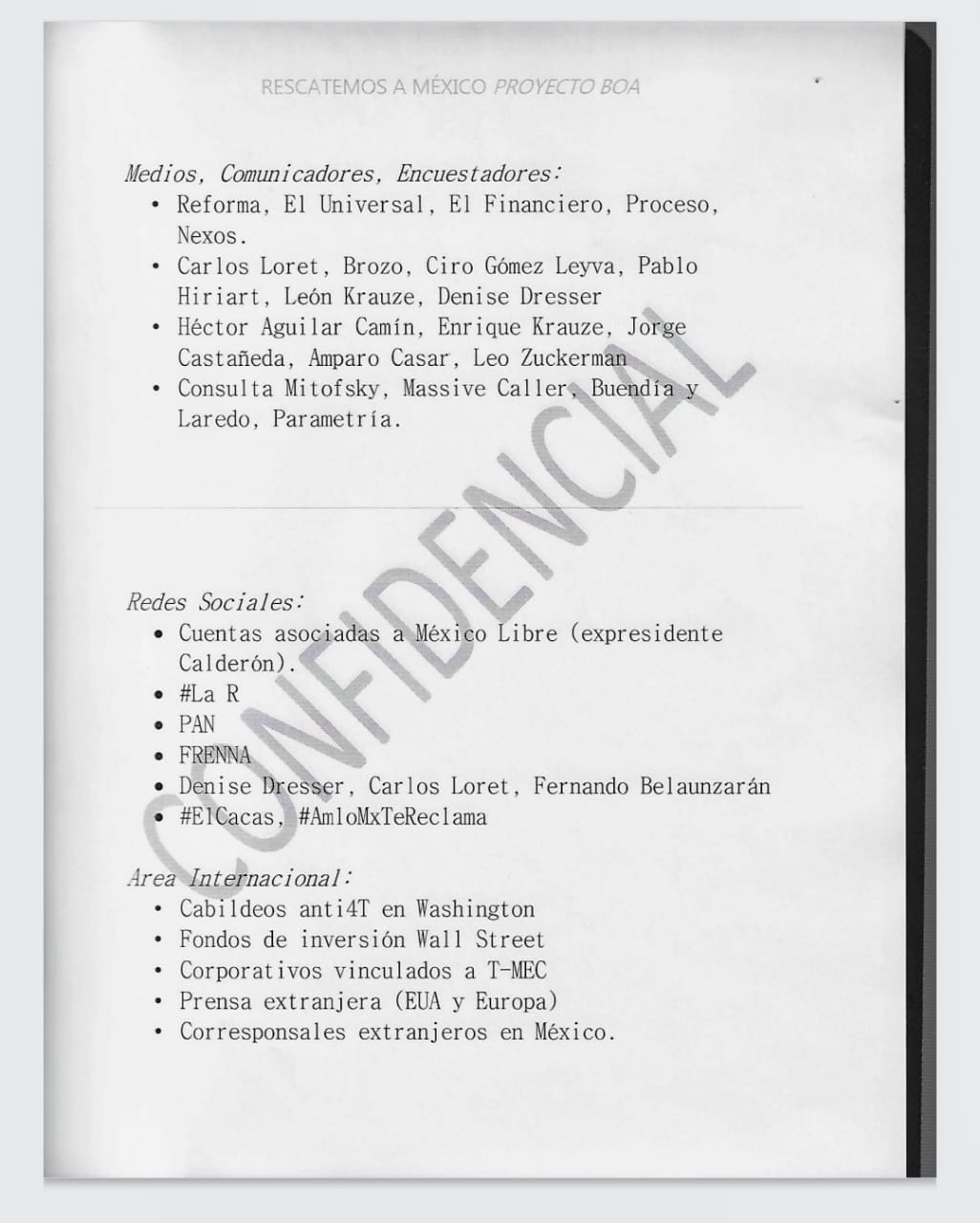 Como los documentos dehan ver, se mencionan como parte de este grupo a personajes como Denise Dresser, Carlos Loret, Fernando Belaunzarán, Ciro Gómez Leyva, León Krauze, Brozo. Muchos de ellos políticos o periodistas que han sido fuertes opositores al gobierno.