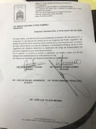 Siete diputados de Morena firmaron un oficio, que se entregó esta mañana en Oficialía de Partes, notificando que habían electo a Alberto Batún como coordinador de su bancada. Esto fue confirmado por el ahora depuesto secretario general, Arturo Castro Duarte, aunque aclaró que ese oficio no pasaba por su oficina, sino que debía ir directo con la Jugocopo.